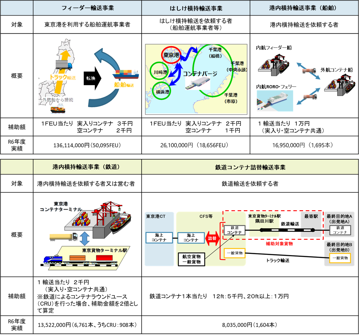 東京港では、東京港の物流効率化や環境負荷軽減を図るため、海上コンテナの国内輸送において、トラックから船舶や鉄道による輸送へとモーダルシフトを行う民間事業者に対する支援を行っています。