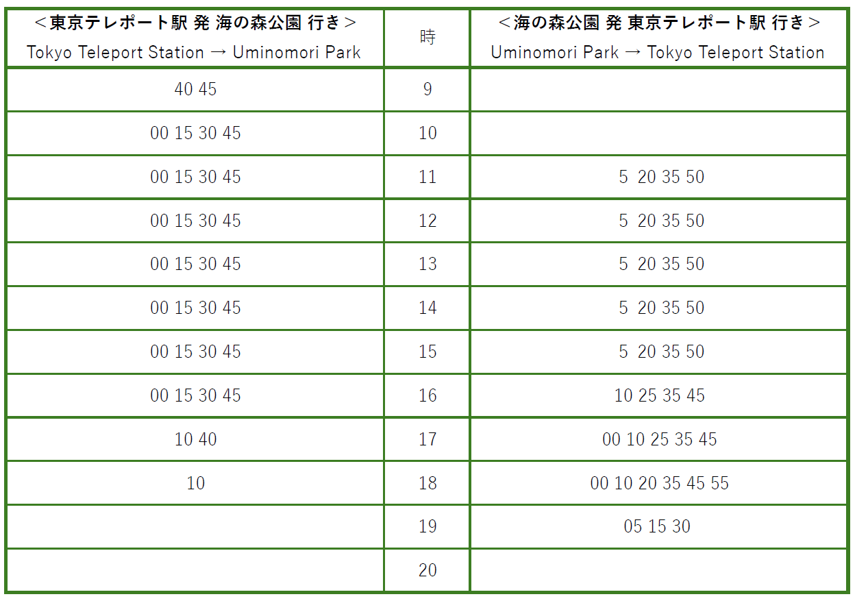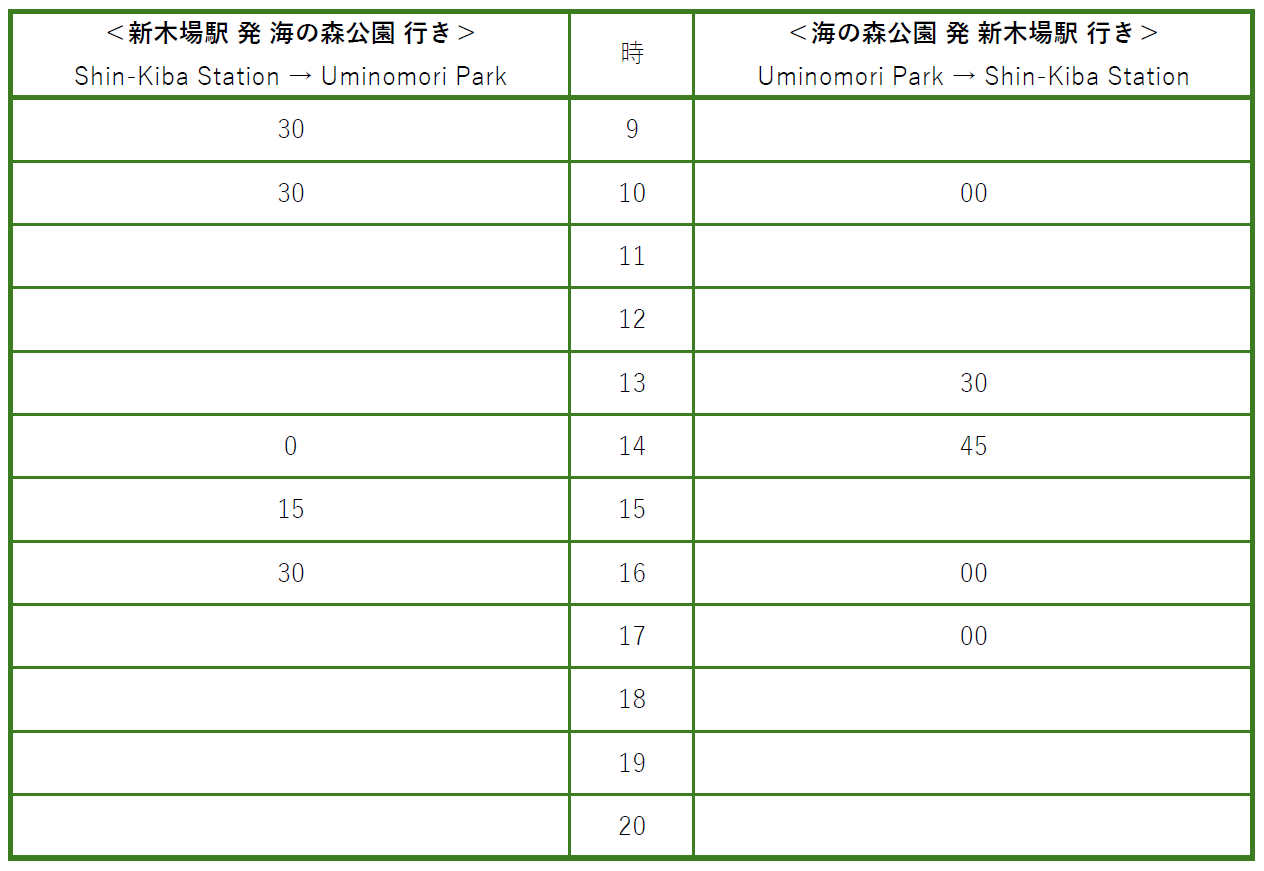 - 都バス りんかい線「東京テレポート」駅から都バス波01系統で「海の森公園」下車