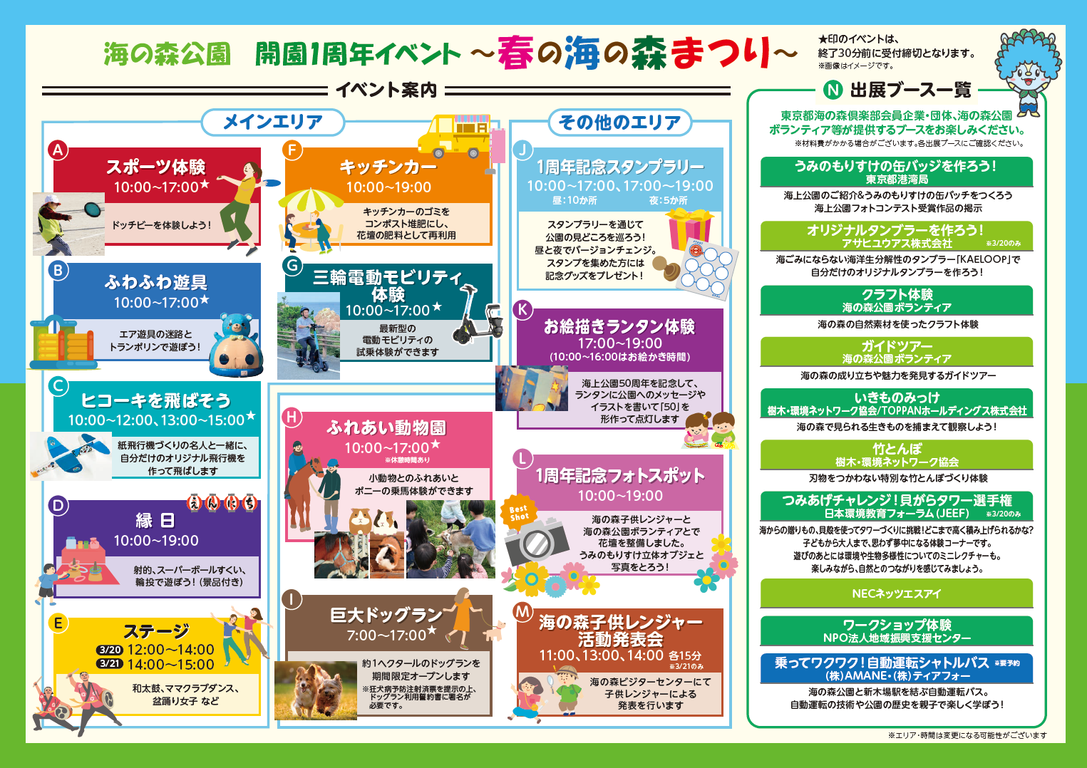 開園1周年を記念し、3月20日と21日の2日間、自然豊かで広大な海の森公園の魅力を体感できる「春の海の森まつり」を開催します。