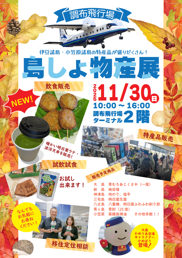昨年に引き続き、周辺地域を始めとした住民の皆様に感謝の気持ちを込めるとともに、広く島しょの魅力を発信するため、今年も調布飛行場ターミナルにて物産展を開催します。