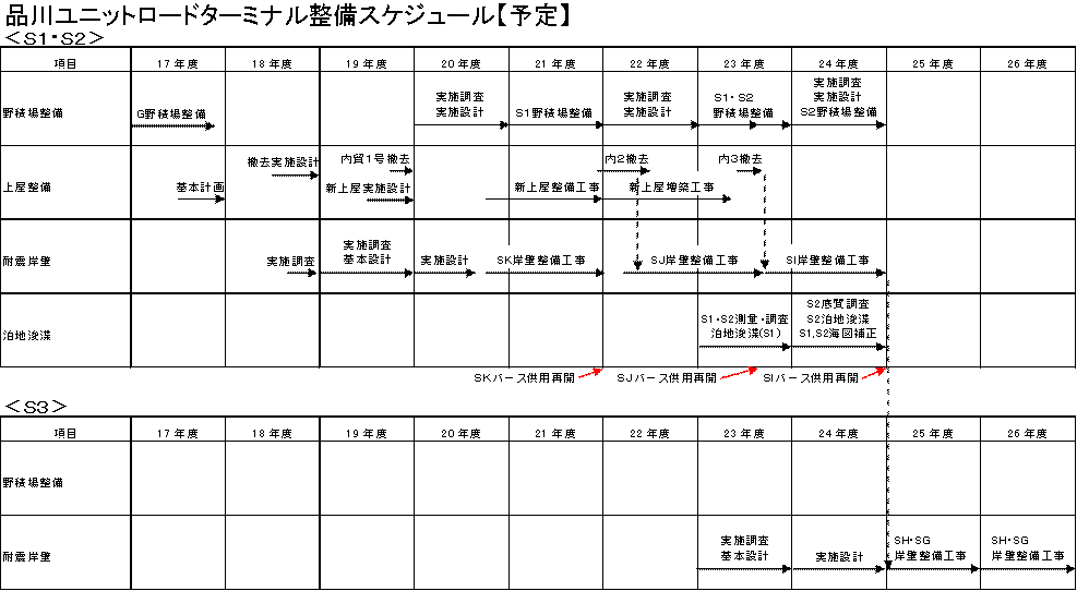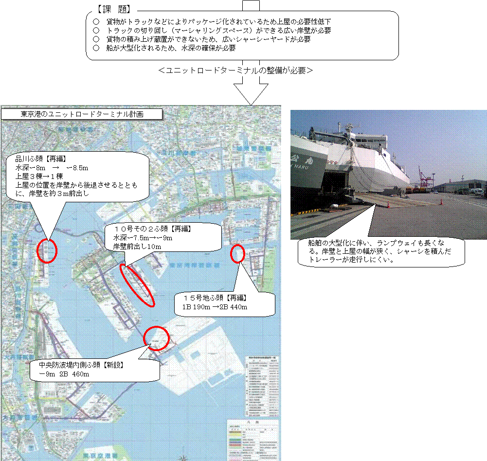 東京港では、貨物のユニット化など内航海運における輸送革新の進展やモーダルシフトの促進等に対応するため、港湾計画に基づき大型のRORO船に対応した内貿ユニットロードターミナルの整備を進めています。