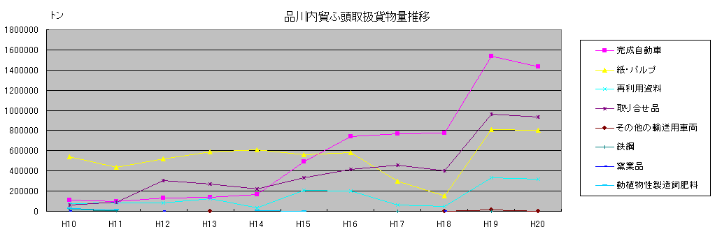 品川内貿ふ頭に船で運ばれてくる貨物は、大手製紙工場のある北海道からの紙、特に新聞紙の巻き取り紙が多い。新聞紙の巻き取り紙は、ここから都内の各新聞社へ運ばれ印刷されます。