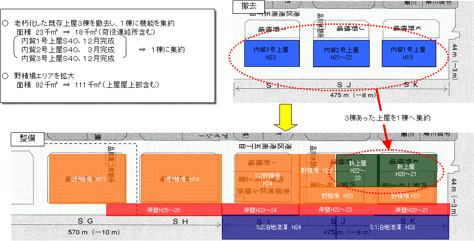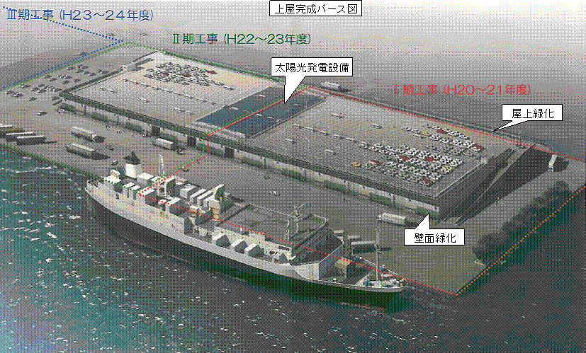 この上屋は、近年の荷役(船への貨物の積み降ろし)形態の変化に対応するため、上屋を岸壁からセットバックし、トレーラーが岸壁上で切り回しできるスペースを確保するとともに、老朽化した3棟の上屋を1棟に集約し、限られたふ頭用地を有効に活用するため、屋上部に商品車を置くことを可能にしました。