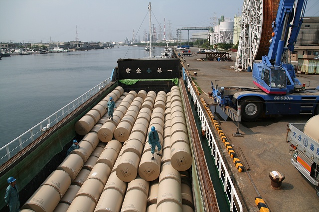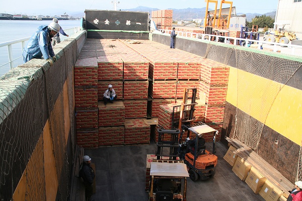 これまでの荷役作業は、船腹にバラ積みしている貨物を陸上クレーンなどにより作業を行うため、時間と人員がかかる荷役となっていた。また、船も小型のものとなっている。