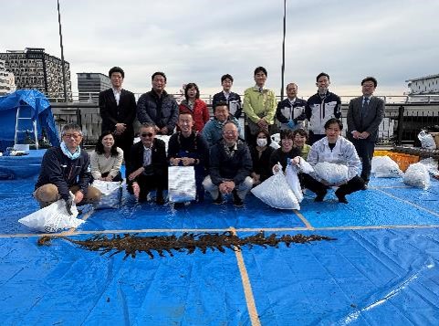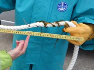 - 設置してから約2.5か月後、一部の幹ロープを陸揚げし、東京港藻場創出活動パートナーの事務局の方々とともに調査した結果、全長2~3m程度に生長していることが確認されました。
