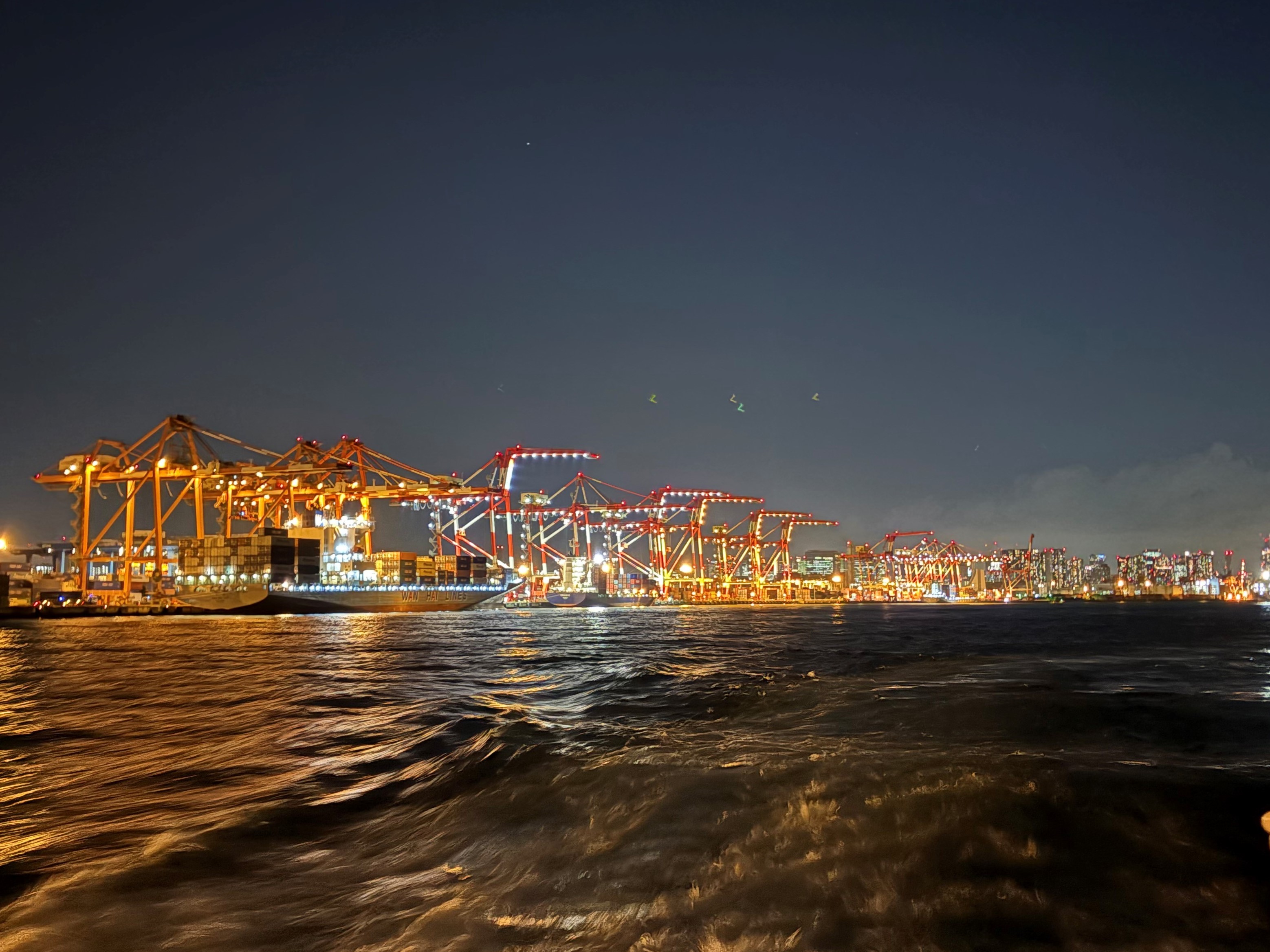 東京港夜景観賞ツアーでは、オレンジ色に染まる巨大なガントリークレーンやライトアップされたレインボーブリッジなど、普段見る機会の少ない東京港の夜景を、陸上と海上の両方からご観賞いただけます。